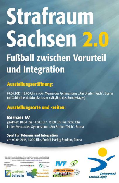 Der Kreis - Sportbund Landkreis Leipzig bringt in Kooperation mit dem Kinder- und Jugendring des Landkreis Leipzig die Ausstellung „Strafraum Sachsen 2.0“ in den Landkreis. In dieser Ausstellung werden Diskriminierungsformen im Sport aufgezeigt und beleuchtet. Im Zeitraum vom 10.04. bis zum 13.04. wird die Ausstellung in Zusammenarbeit zwischen dem Bornaer Sportverein 91 e.V. und dem Gymnasium am Breiten Teich Borna in der Aula des Gymnasiums gezeigt und mit einem Rahmenprogramm begleitet.